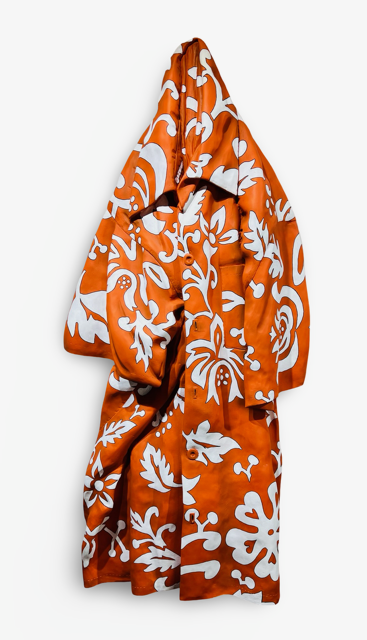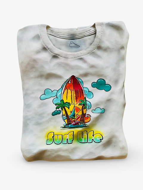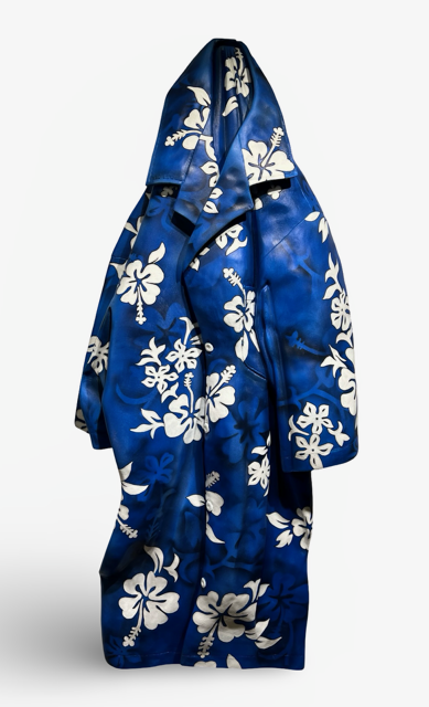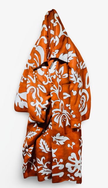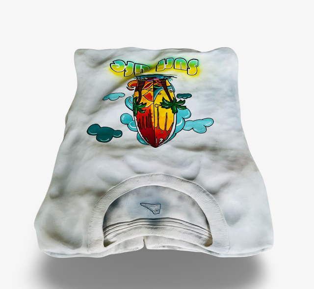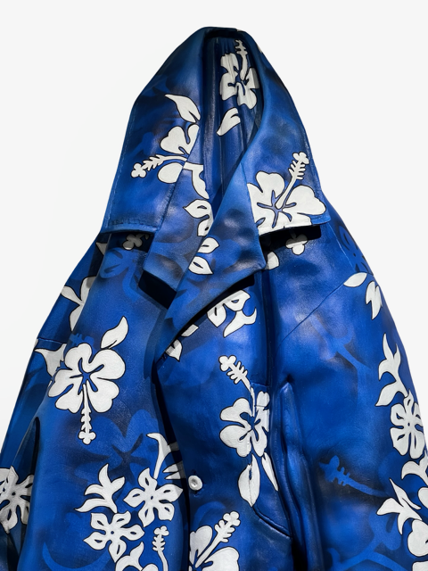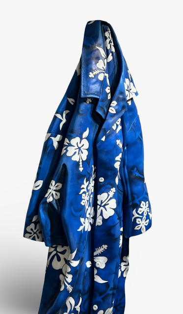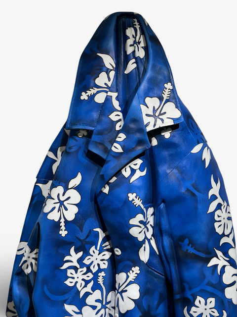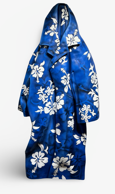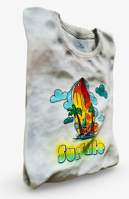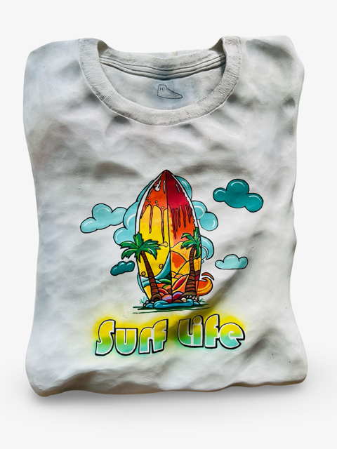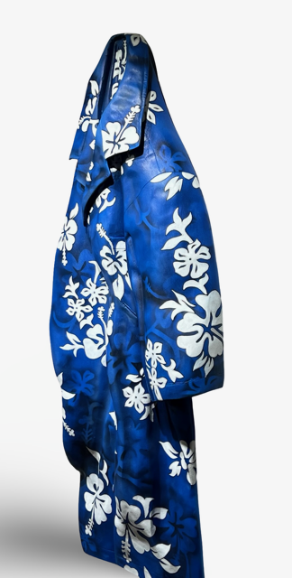 This hand carved and hand painted wood carving of a folded shirt is beautifully detailed and colorfully painted with a classic Hula Girl design. She is depicted gracefully surrounded by vibrant Hawaiian hibiscus flowers and lush green leaves, capturing the essence of tropical paradise. This unique carving can be easily hung on a wall using a simple nail or displayed flat on a shelf, adding a charming, island-inspired touch to any space.
